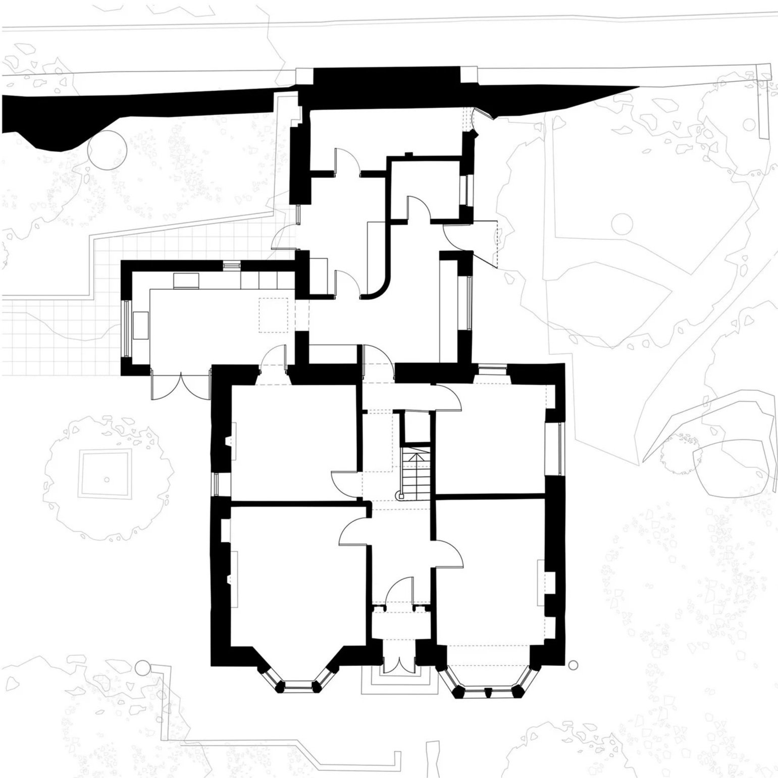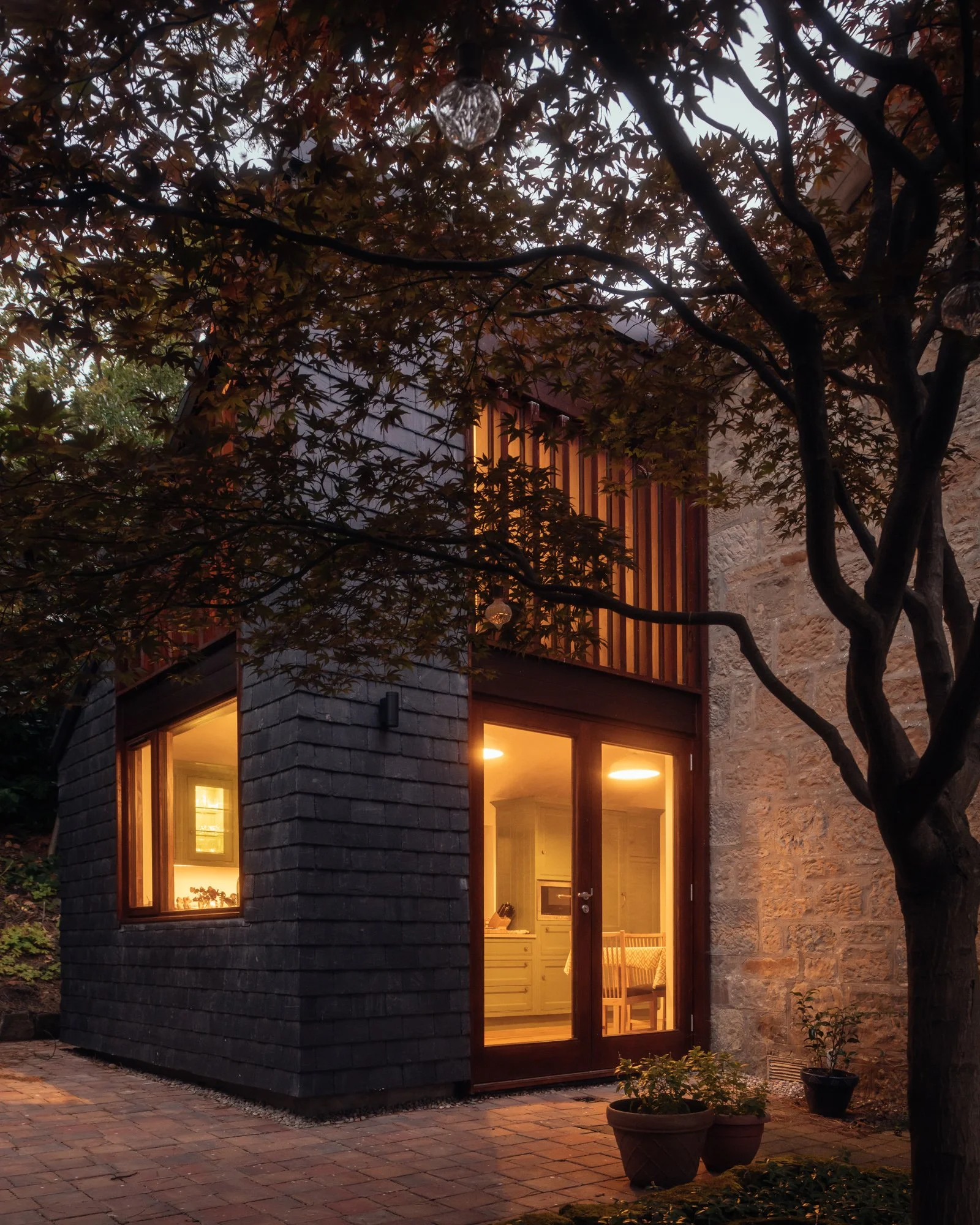 A new kitchen wing is designed to sit discreetly with the existing house, helped by a new roof designed to literally extend from the main roof forming a simple mono-pitch. The same reclaimed Scotch slate is applied to the extension walls’, providing a maintenance-free exterior and allowing the existing house’s honey blonde sandstone to retain its attractive presence in the mature landscape. The existing kitchen space is reconfigured to form a generous and welcoming reception area with built in storage and seating for taking off shoes. A new utility space doubling as an artist’s studio is accessed through a cleverly hidden door located in a new curved, oak-lined wall. In the kitchen extension, the ceiling soars to welcome in a different quality of light and views from that of the existing house, and sunlight is modulated through high slatted timber screens.